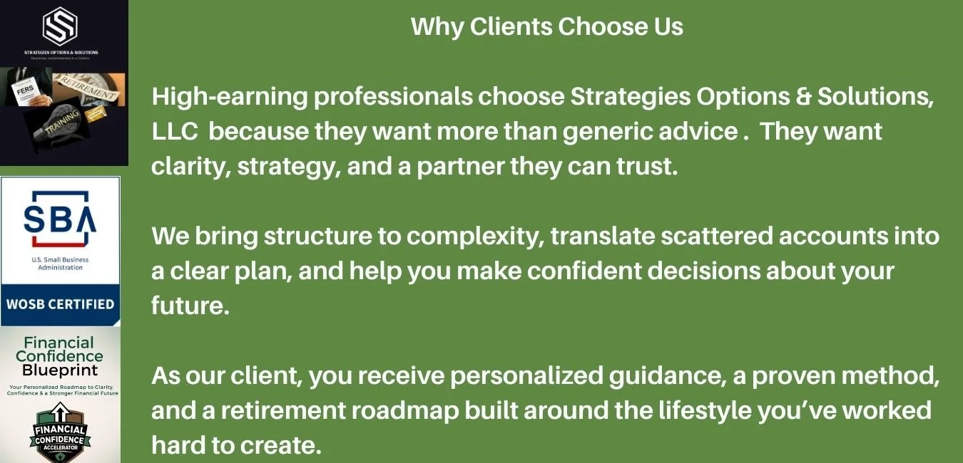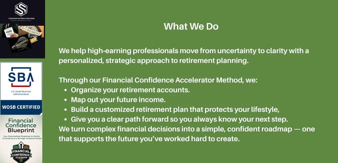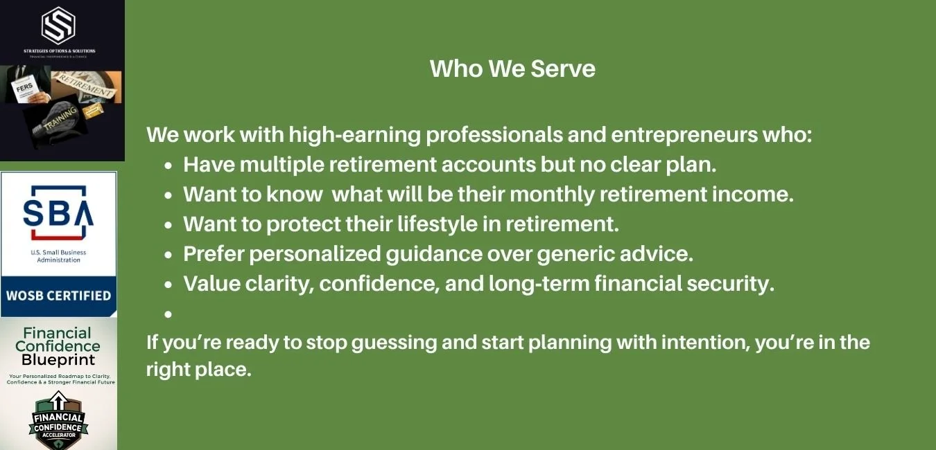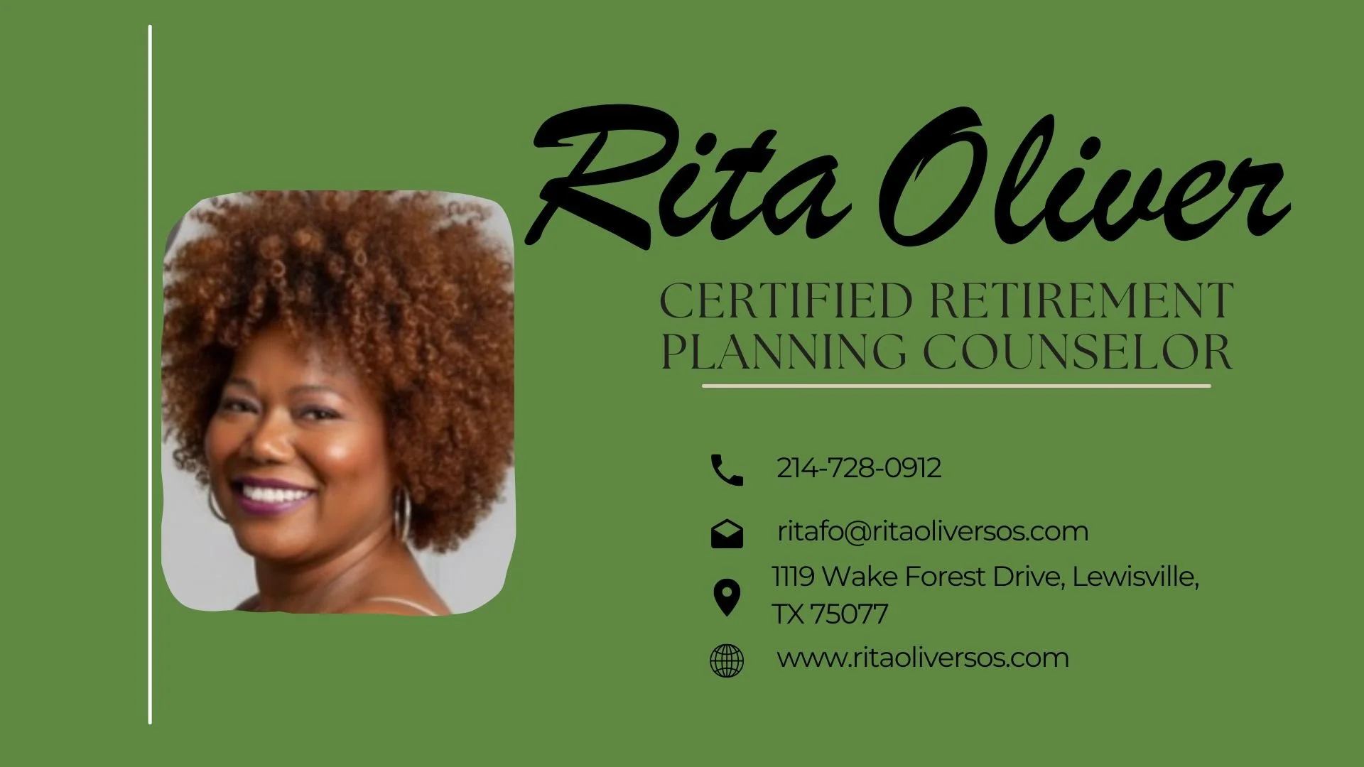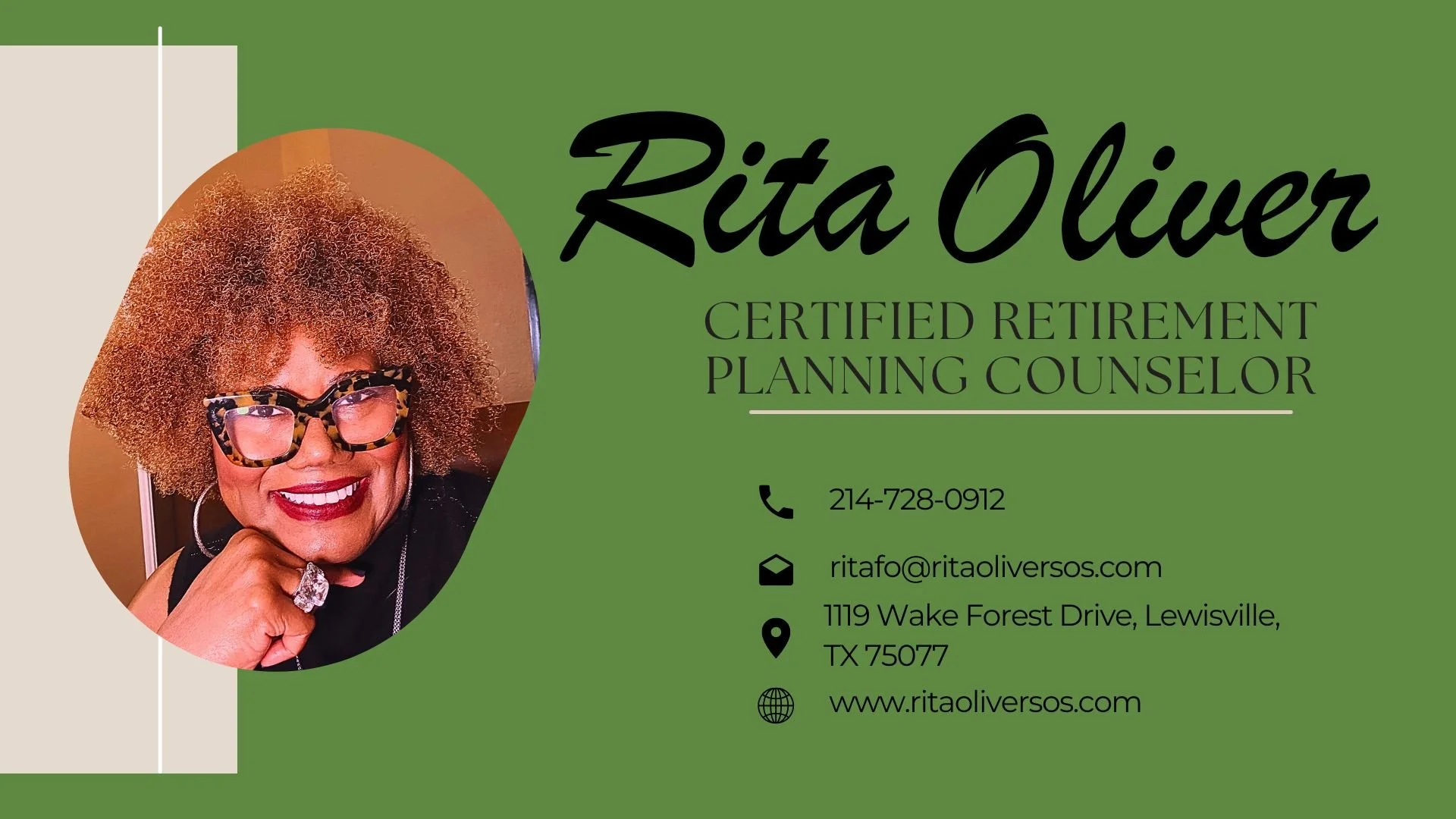 “I turn confusion into clarity, scattered accounts into a strategy, and high earners into confident future retirees who know exactly where they’re going and how they’ll get there.” — Rita Oliver, CEO/President, SOS, LLC